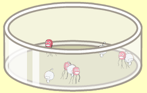 同じ菌を10体集めるとコロニーを作って合体!!シャーレを飛び出してデスクトップ内を動き回るんだって!!O-157とか可愛すぎるだろ、コレ!!なんかしゃべってるー!!軽くペット感覚だ。あ、赤いやつがO-157!!